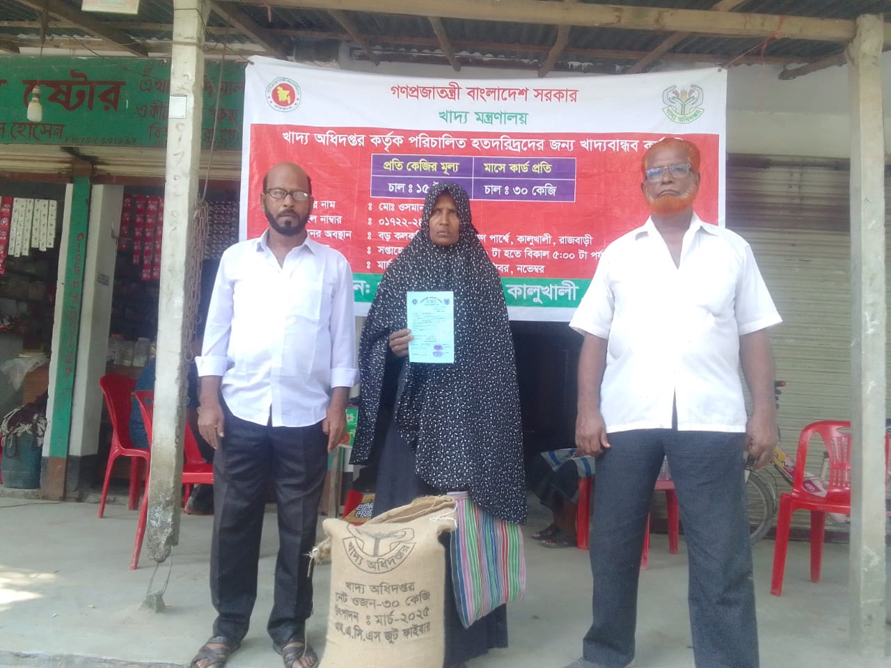 কালুখালীর মৃগী ইউনিয়নের কলকলিয়া বাজারে খাদ্য বান্ধব কর্মসূচির ডিলার ওসমান গনি মন্ডল ৫০০ কার্ডধারীদের মাঝে ১৫ টাকা কেজি দরে ৩০ কেজি করে চাউল বিতরন করেছে। চাউল বিতরনকালে ডিলার ওসমান গনি মন্ডল বলেন আমি প্রতি বারের ন্যায় এবারও সুষ্ঠুভাবে চাউল বিতরন করতে পেরে আনন্দিত। জনগন উৎসব মুখর পরিবেশে চাউল নিচ্ছে।