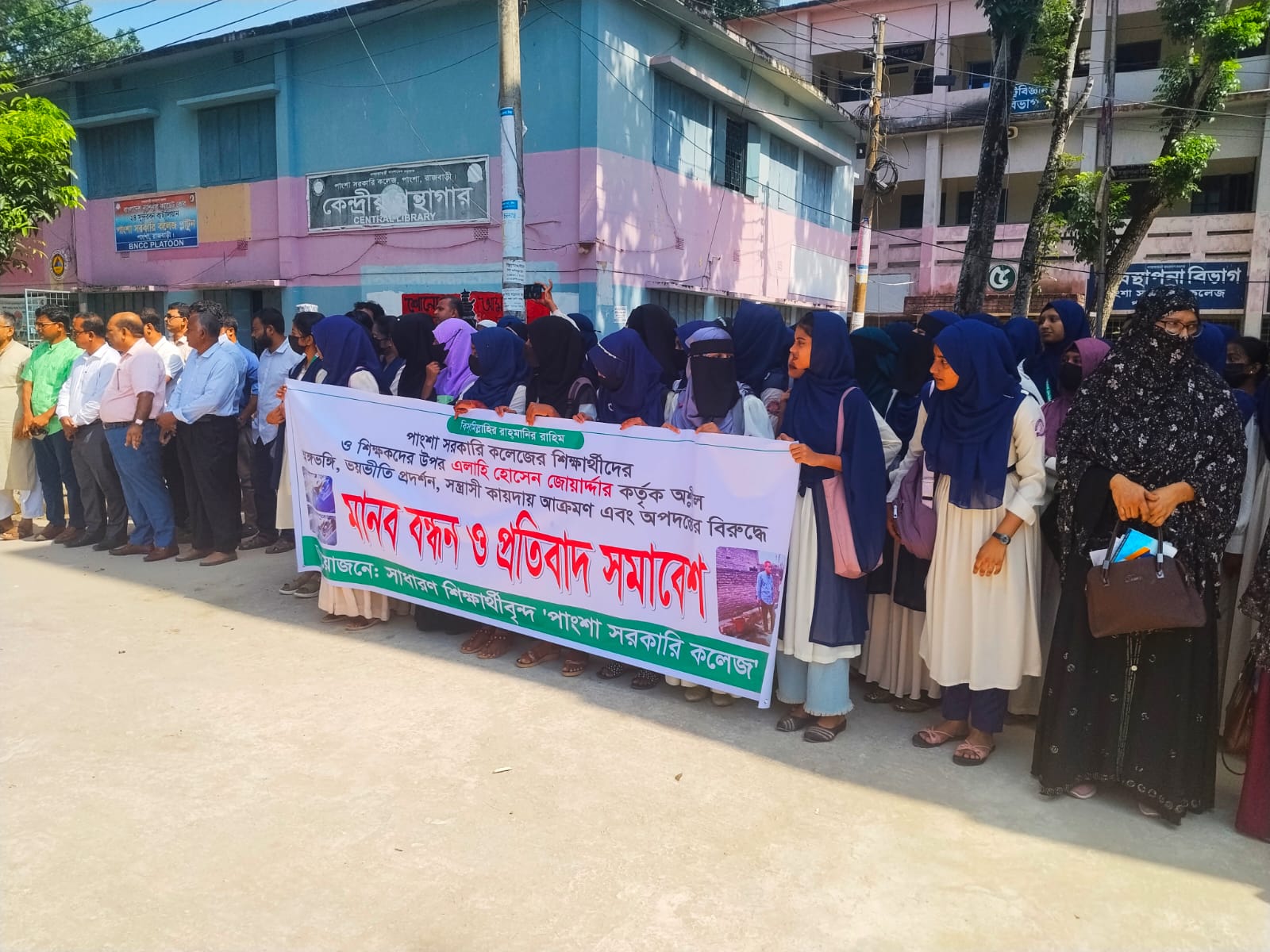 এস,কে পাল সমীর, পাংশা (রাজবাড়ী) প্রতিনিধি : রাজবাড়ীর পাংশা সরকারি কলেজের শিক্ষক ও শিক্ষার্থীদের ওপর এলাহি হোসেন জোয়াদ্দার কর্তৃক অশ্লীল অঙ্গভঙ্গি, ভয়ভীতি প্রদর্শন, সন্ত্রাসী কায়দায় আক্রমণ এবং অপদস্ত করার ঘটনার প্রতিবাদে মানববন্ধন ও প্রতিবাদ সমাবেশ অনুষ্ঠিত হয়েছে।
