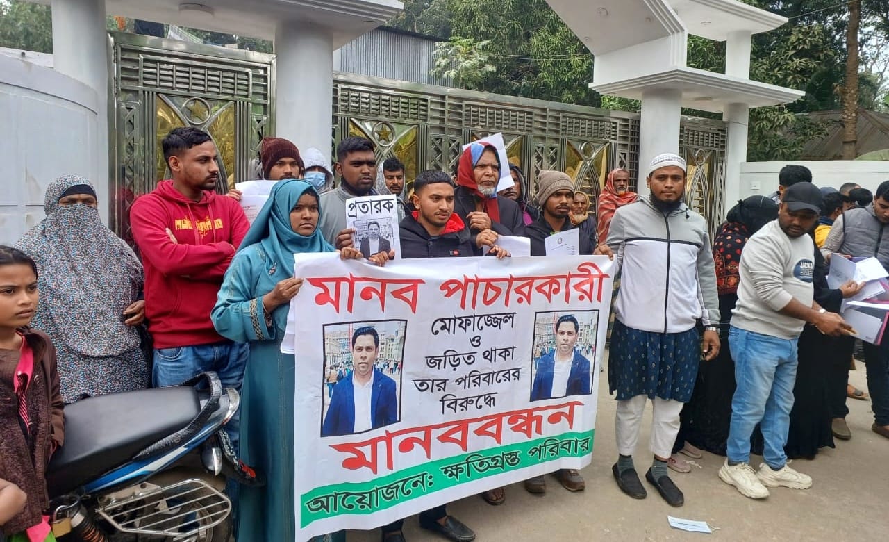 বুধবার (২৪ ডিসেম্বর) দুপুরে রাজবাড়ী সদর উপজেলার মিজানপুর ইউনিয়নের সোনাকান্দর এলাকার ইতালী প্রবাসী অভিযুক্ত প্রতারক মোফাজ্জলের বাড়ির সামনে ভুক্তভোগীদের পরিবারবর্গের ব্যানারে এ বিক্ষোভ ও মানববন্ধনের আয়োজন করা হয়। ঘটনায় অভিযুক্ত ওই ইতালী প্রবাসীর নাম মোফাজ্জল।