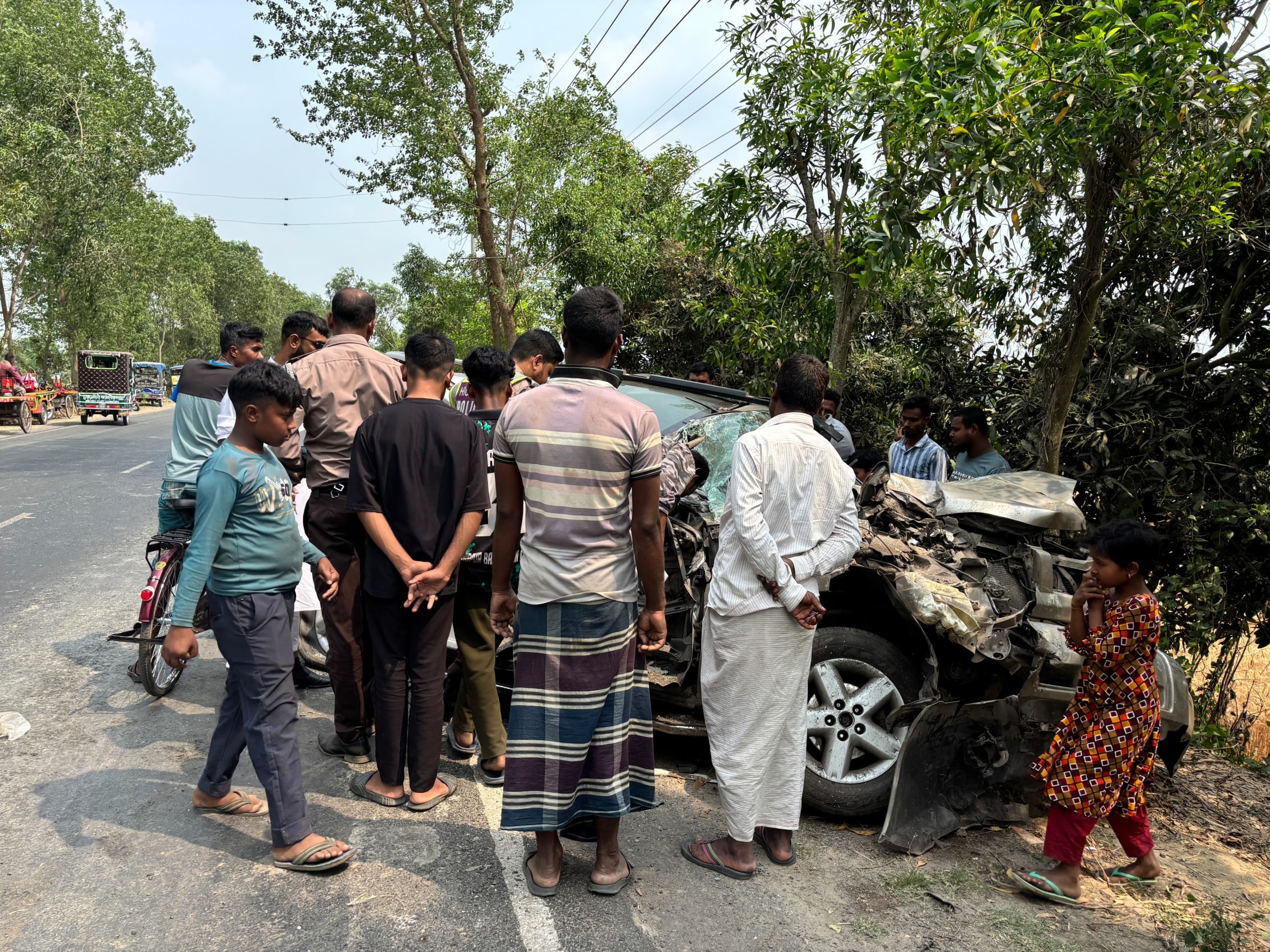 পুলিশ ও স্থানীয় সূত্রে জানা যায়, ঢাকাগামী গোল্ডেন লাইন পরিবহনের একটি বাস (ঢাকা মেট্রো-ব ১৫-০২০৭) নিয়ন্ত্রণ হারিয়ে বাম দিক থেকে ডান পাশে উঠে গেলে বিপরীত দিক থেকে আসা একটি প্রাইভেটকারের (ঢাকা মেট্রো-ঘ ১১-৯৩৬২) সঙ্গে মুখোমুখি সংঘর্ষ হয়। এতে প্রাইভেটকারটি দুমড়ে-মুচড়ে যায়।