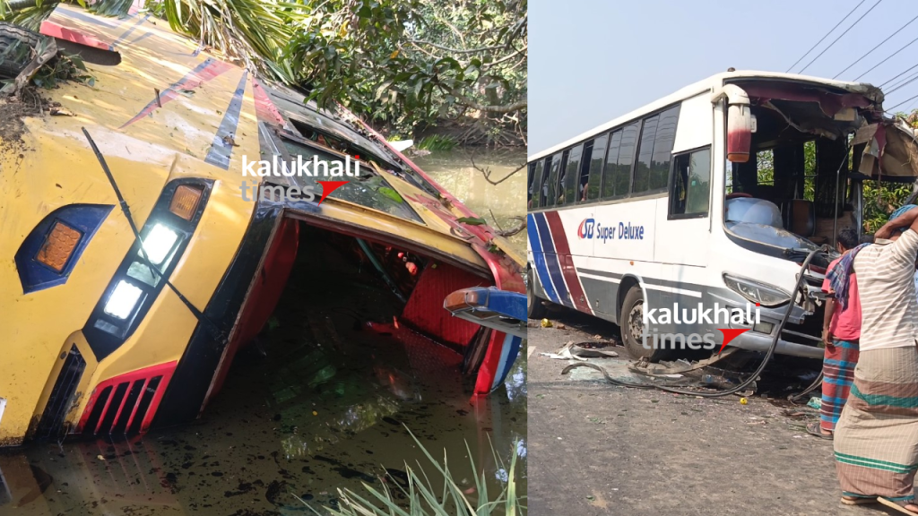 কালুখালীতে বাসের ধাক্কায় নিয়ন্ত্রণ হারিয়ে অপর বাস পুকুরে, আহত ১৩