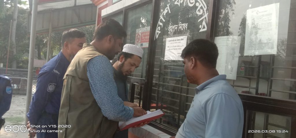 রাজবাড়ীর বালিয়াকান্দি উপজেলায় জ্বালানি তেলের দোকান ও বাজারে ভ্রাম্যমাণ আদালতের অভিযান পরিচালনা করা হয়েছে। রবিবার (৮ মার্চ ২০২৬) বিকেলে এ অভিযান পরিচালনা করেন বালিয়াকান্দি উপজেলার সহকারী কমিশনার (ভূমি) ও এক্সিকিউটিভ ম্যাজিস্ট্রেট এহসানুল হক শিপন। অভিযানকালে উপজেলার একমাত্র পেট্রোল পাম্প এবং জামালপুর বাজারে অবস্থিত জ্বালানি তেলের দোকানসমূহ পরিদর্শন করা হয়। এ সময় সংশ্লিষ্ট ব্যবসায়ীদের সরকারি […]