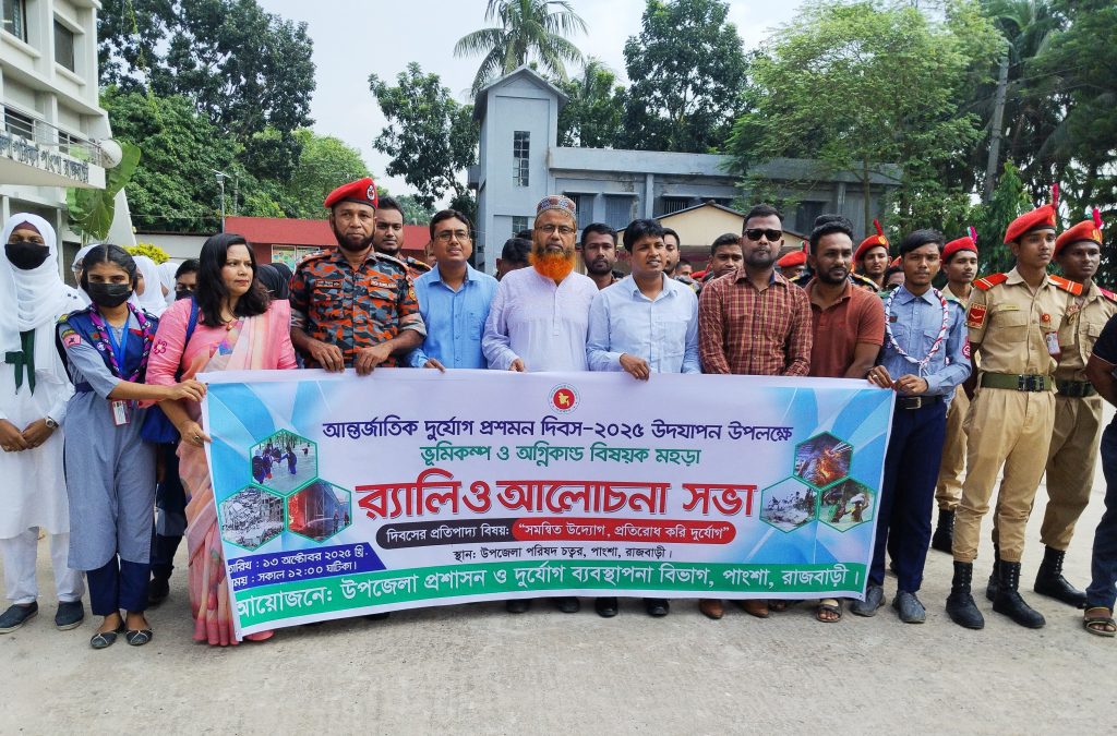 এস.কে. পাল সমীর, পাংশা (রাজবাড়ী) প্রতিনিধি: “সমন্বিত উদ্যোগ, প্রতিরোধ করি দুর্যোগ” এ প্রতিপাদ্যে রাজবাড়ীর পাংশায় আন্তর্জাতিক দুর্যোগ প্রশমন দিবস-২০২৫ পালিত হয়েছে। দিবসটি উদযাপন উপলক্ষে ভূমিকম্প ও অগ্নিকাণ্ড বিষয়ক মহড়া, র্যালি ও আলোচনা সভা অনুষ্ঠিত হয়। সোমবার (১৩ অক্টোবর) দুপুর ১২টায় উপজেলা পরিষদ চত্বরে উপজেলা প্রশাসন ও দুর্যোগ ব্যবস্থাপনা বিভাগের আয়োজনে উপজেলা পরিষদ চত্ত্বর থেকে […]