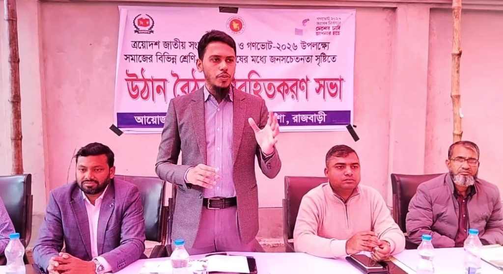 এস,কে পাল সমীর, পাংশা (রাজবাড়ী) প্রতিনিধি : ত্রয়োদশ জাতীয় সংসদ নির্বাচন ও গণভোট-২০২৬ উপলক্ষে সমাজের বিভিন্ন শ্রেণি-পেশার মানুষের মধ্যে জনসচেতনতা সৃষ্টির লক্ষ্যে রাজবাড়ীর পাংশায় উঠান বৈঠক/অবহিতকরণ সভা অনুষ্ঠিত হয়েছে। বৃহস্পতিবার (২২ জানুয়ারি) সকালে বিএডিসি (সেচ) কার্যালয়ের সামনে পাংশা উপজেলা প্রশাসনের আয়োজনে এ সভা অনুষ্ঠিত হয়। সভায় নির্বাচন ও গণভোট নিয়ে বক্তব্য রাখেন, উপজেলা নির্বাহী অফিসার […]